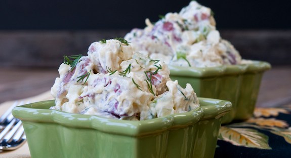 3.Drain potatoes; cube and place in a large serving bowl. Cool slightly. Add onion and dressing, stir gently to coat. Cover and refrigerate for 2 hours or overnight.