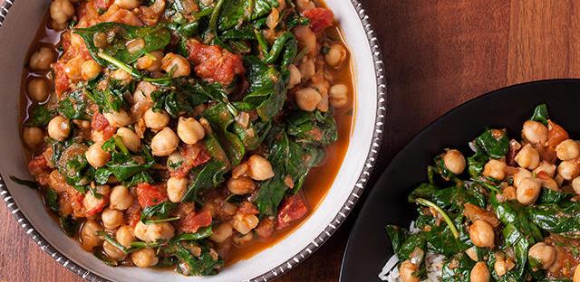 3.Drain and rinse the chickpeas. Add them to the skillet along with the tomato sauce. Stir well to distribute the spices in the sauce and heat through (5 minutes). Serve over rice or with bread.