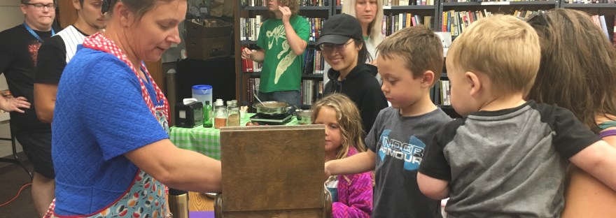 On one of the rainiest days of the summer this season, we were excited to be inside making some noise with the flour mill at Tastebuds!. Shyla, a Morris Area Farmers Market vendor, brought in her flour mill, along with corn and wheat to use in the mill.